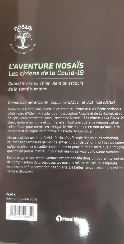 L’aventure Nosaïs : les chiens détecteurs de la Covid 19 retrace les remarquables travaux de Dominique Grandjean, Capucine Gallet et Clothilde Julien pour diffuser ces puissantes capacités olfactives de nos amis les chiens.